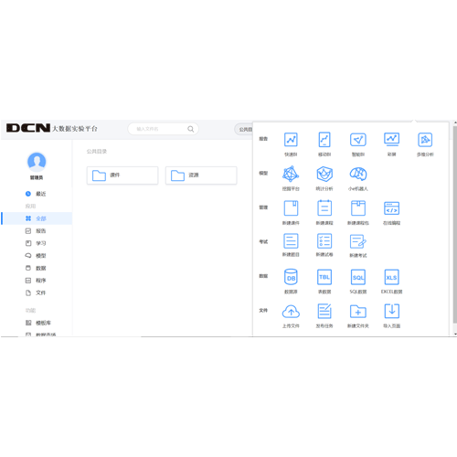 DCN 大数据及人工智能实训系列产品,从实验环境、实验课程、实验数据、实验手册、实验报告等多方面为大数据及人工智能给予一站式教学服务,大幅度较低了大数据和人工智能“教”与 “学”的门槛,满足学校教学课程设计、上机实验、实习实训、科研训练等多方面需求,帮助高校建设大数据及人工智能实验室。...