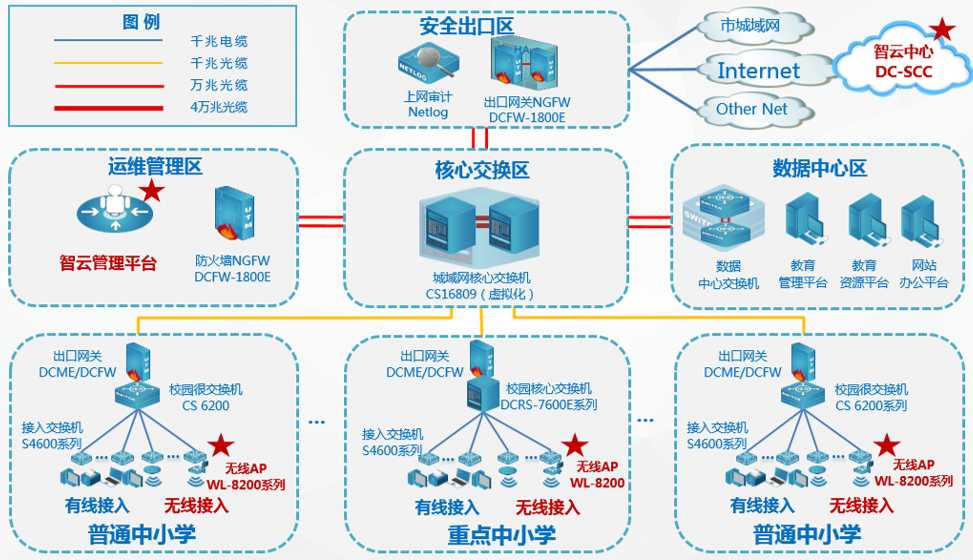 在充分理解普教客户的真实需求,关注用户的使用体验,结合多年先进的网络实际部署经验基础上,DCN提出了“易管理、易运维、易使用、易安全”的新内涵!