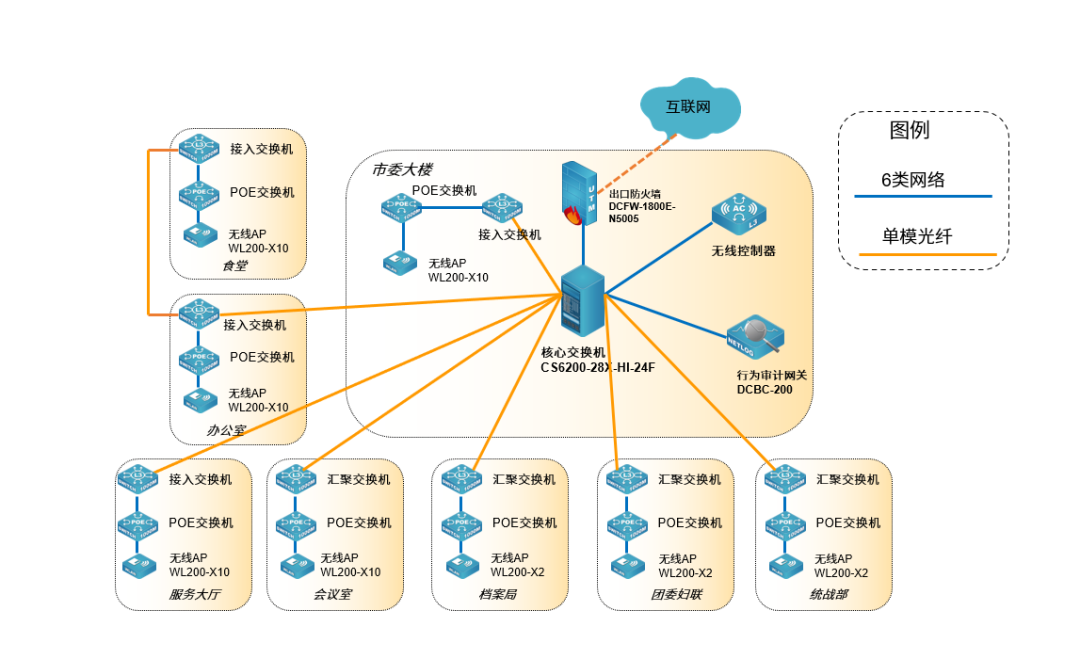 靖西市政府无线网络安全覆盖涵盖市委大楼、统战部、团委妇联、档案局、服务大厅等重要单位部门,越来越多的工作流程都在网络中进行。本次方案中,采用了DCN 4频14流的旗舰型WiFi6无线AP WL8200-X10在人员密集和数据量较大的场所进行覆盖,为靖西市政府庞大的办公系统、财务系统、审批系统等给予了稳定、高速的网络环境。